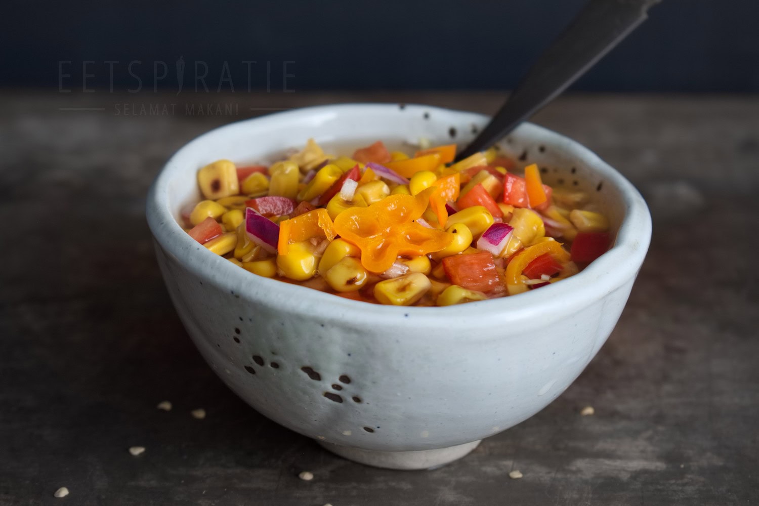Atjar jagung – zoetzuur van mais en adjuma peper, geeft je gerechten een kick! Ik heb bij elk gerecht iets van een ‘zuurtje’ nodig. Klinkt een beetje ‘cheffy’, maar een zoetzuur of een pickle maakt mijn gerechten compleet. Iedereen heeft een verdwaald blikje mais achterin zijn voorraadkast staan, en deze kun je perfect gebruiken om een frisse atjar van te maken. De adjuma peper is mijn persoonlijke touch aan deze atjar en geeft het een frisse en fruitige smaak.