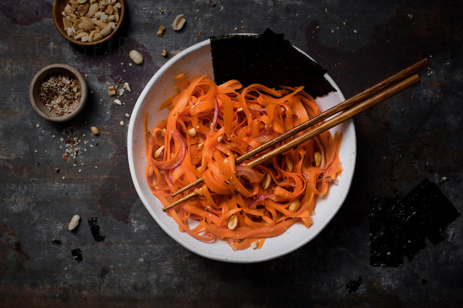Om deze salade snel te maken, kun je het beste een dunschiller gebruiken. Zo’n schiller die je gebruikt voor het schillen van aardappels en het maken van komkommerlinten en courgettelinten. Vervolgens maak je een dressing, hak je pinda’s, snijd je een ui fijn en dan kun je de salade gaan samenstellen. Wat ik zelf een lekkere toevoeging vind aan deze salade zijn stukjes crispy norivel. In de winkel en toko kun je deze kopen onder de naam ‘nori snack’. Eet ze in combinatie met de salade of doe een beetje van de salade in een velletje en vouw hem dicht. Deze combinatie is echt heel lekker!