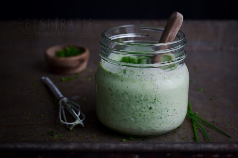 Bieslook yoghurtdressing, een dressing die iets weg heeft van ouderwetse slasaus. Je kunt het niet alleen gebruiken als een dressing maar ook als een dip voor groenten. Of als basis voor een frisse aardappelsalade of komkommersalade. Het is een licht en romig recept op basis van mayonaise en yoghurt.