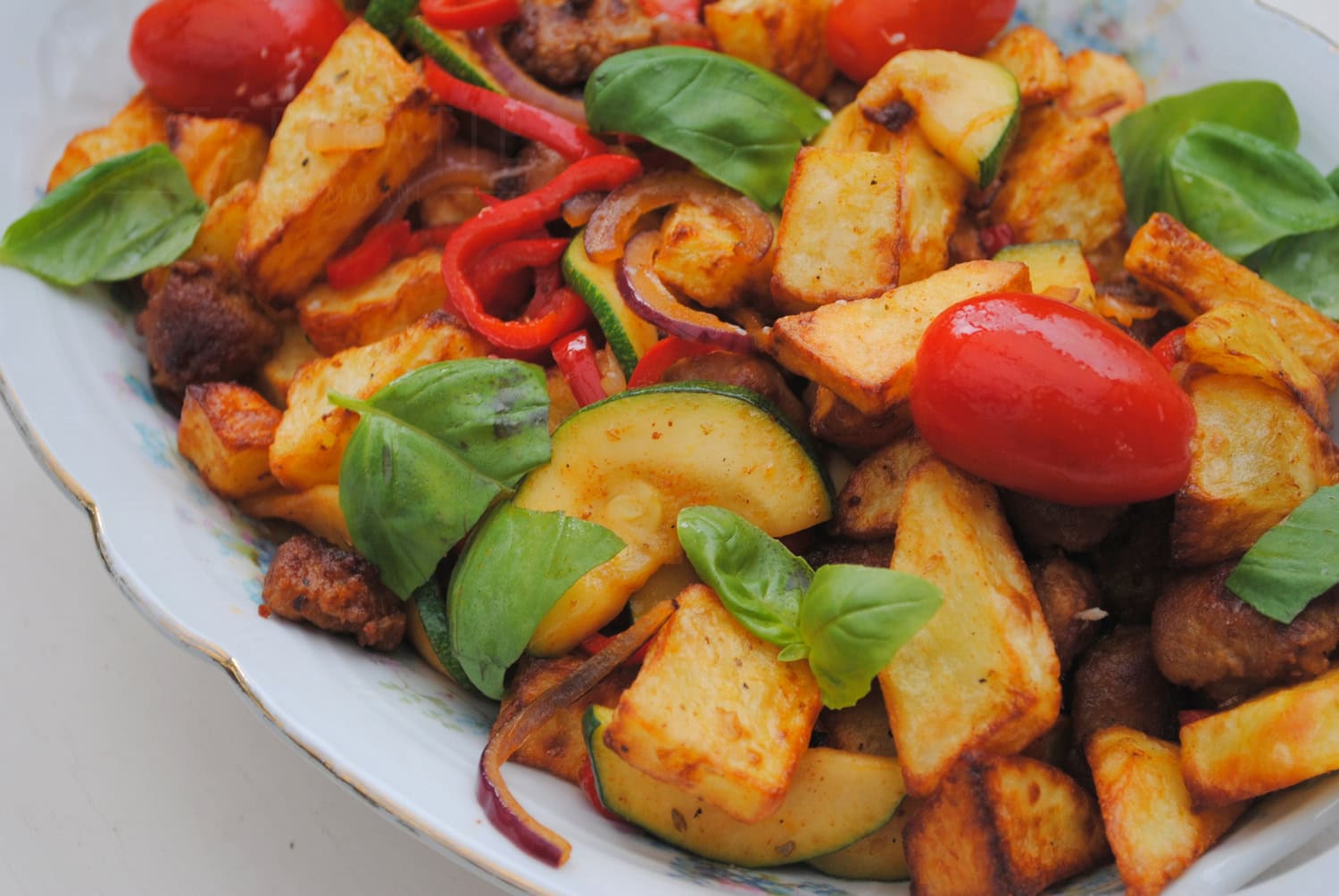 Italiaanse roerbakschotel, een makkelijk gerecht voor doordeweekse dagen of een luie zondag. Elke keer probeer ik mezelf weer uit te dagen om met ingrediënten uit mijn koelkast een gerecht te bedenken. Met een paar verse producten en een rondje in je voorraadkast zet je heel snel een lekker gerecht op tafel. Met verse groenten, aardappels en worstjes maak je snel een roerbakschotel met een Italiaans tintje.