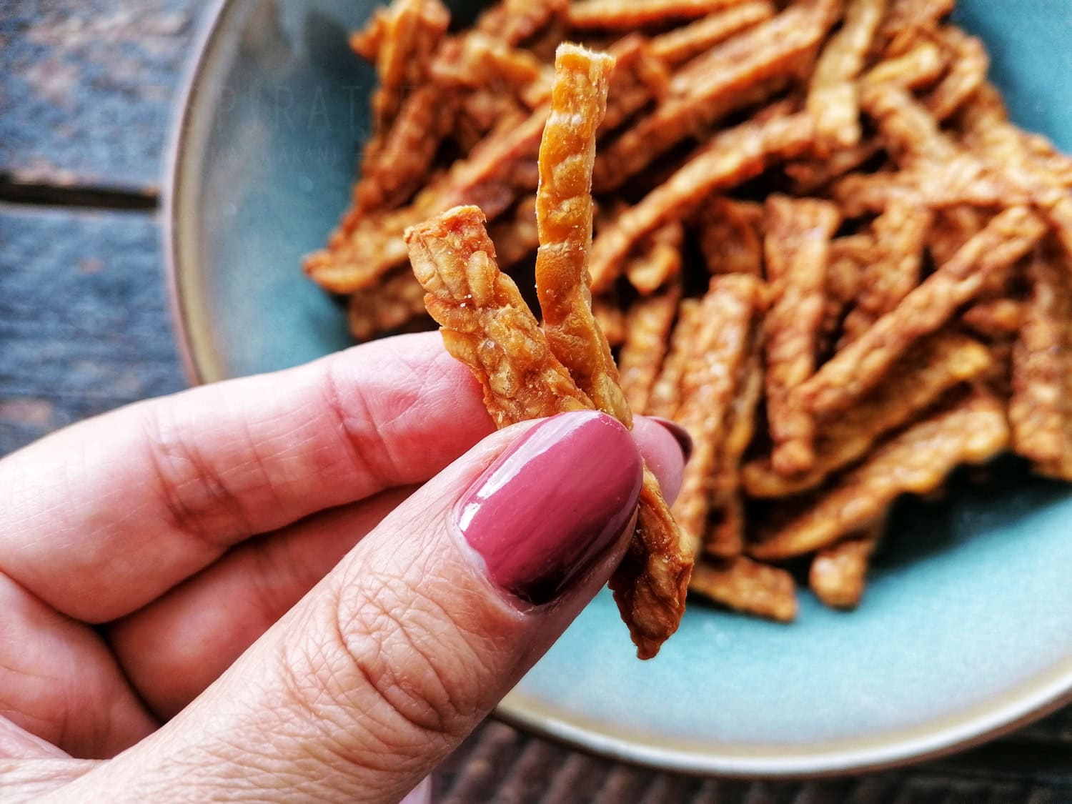 Je kunt in plaats van reepjes ook plakjes snijden van de tempeh. Deze dunne plakjes worden lekker krokant in de airfryer. Lekker om te eten als chips met dip of je gebruikt de plakjes als beleg op een broodje.