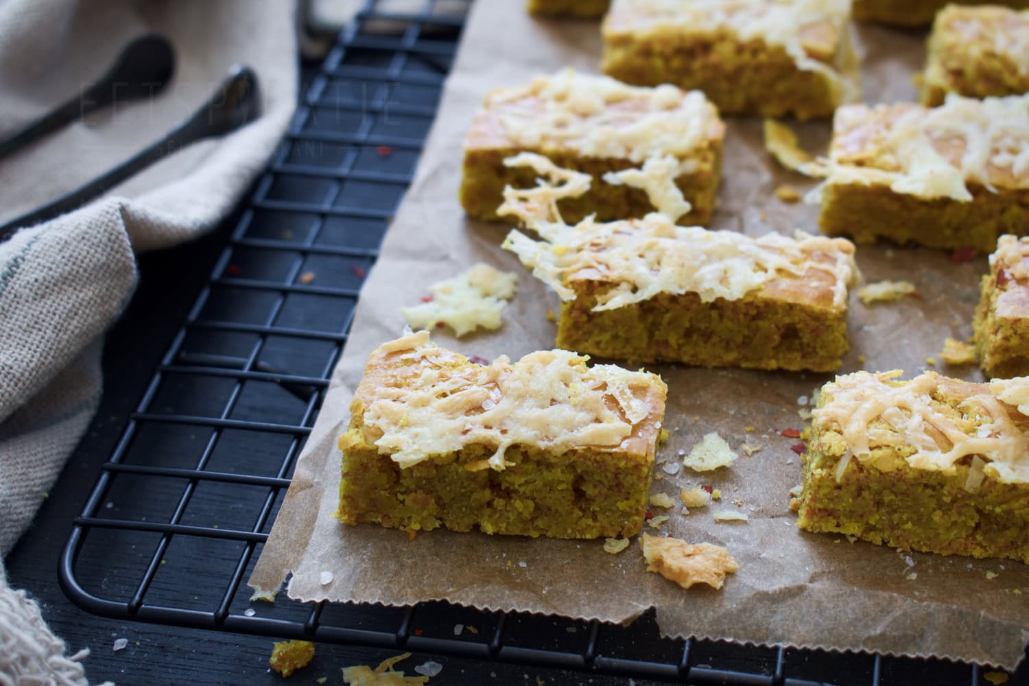 - Bestrijk het deeg met de resterende eidooier. Bak de koek 15 minuten. Neem de bakplaat uit de oven en snijd de koek in kleine koekjes van 5 bij 2 centimeter en bestrooi met de resterende 150 gram kaas. Bak de koekjes in 5 minuten verder gaar.