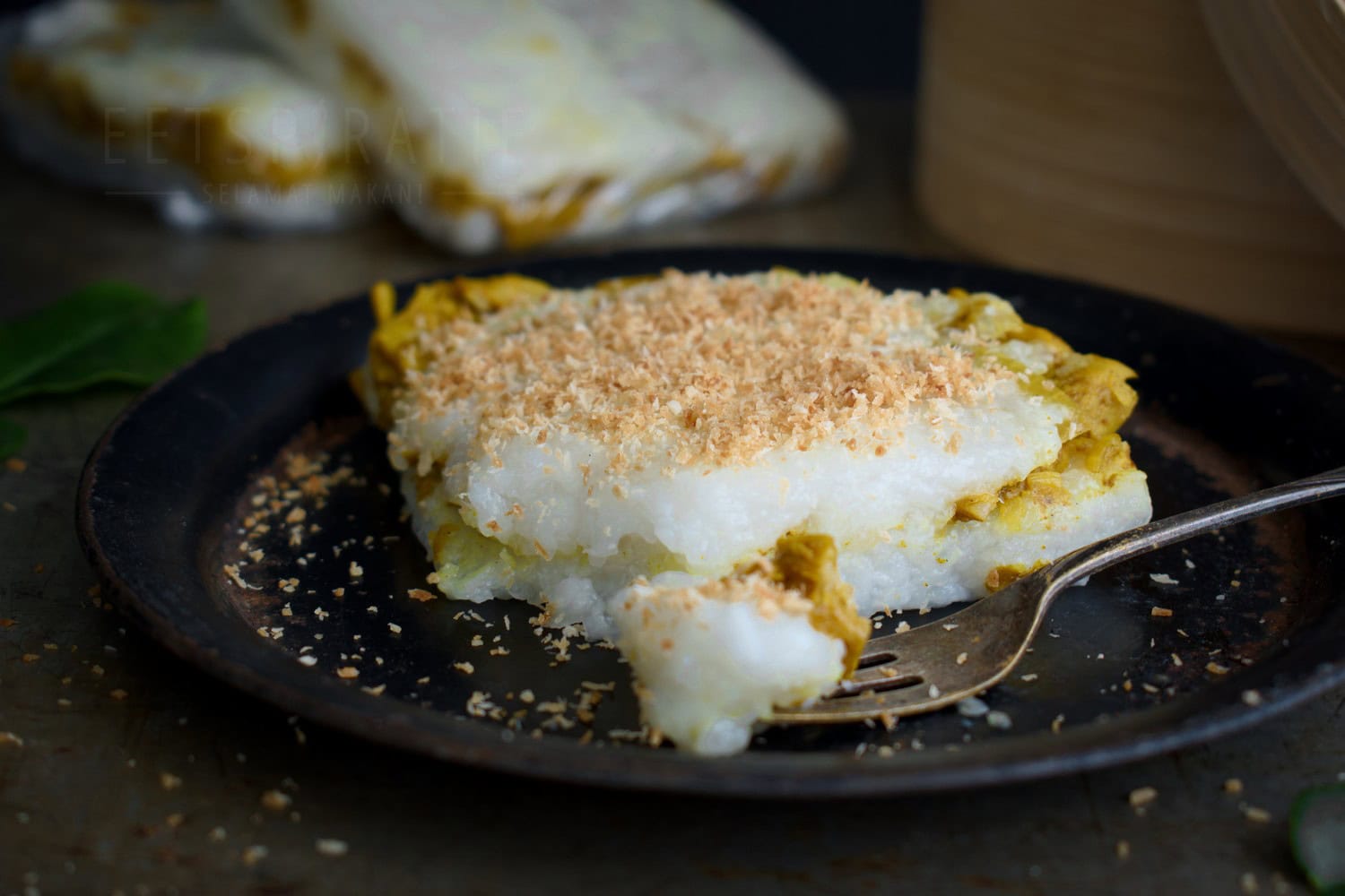 - Breng nu de kokosmelk rustig aan de kook. Voeg vervolgens de gestoomde rijst toe en nu ga je 15 tot 20 minuten roeren tot al het vocht is opgenomen door de rijst. Doe dit op een laag tot middelhoog vuur. Eerst zet het mengsel eruit als rijstpudding maar naarmate het vocht wordt opgenomen, wordt het steeds meer een stevige massa. Na 20 minuten is de consistentie goed. Zet het vuur uit en vis de djeroek poeroet blaadjes en de serehstengel eruit. Nu ga je het gerecht samenvoegen. Verdeel het mengsel in de pan (op het oog) door de helft met een spatel.