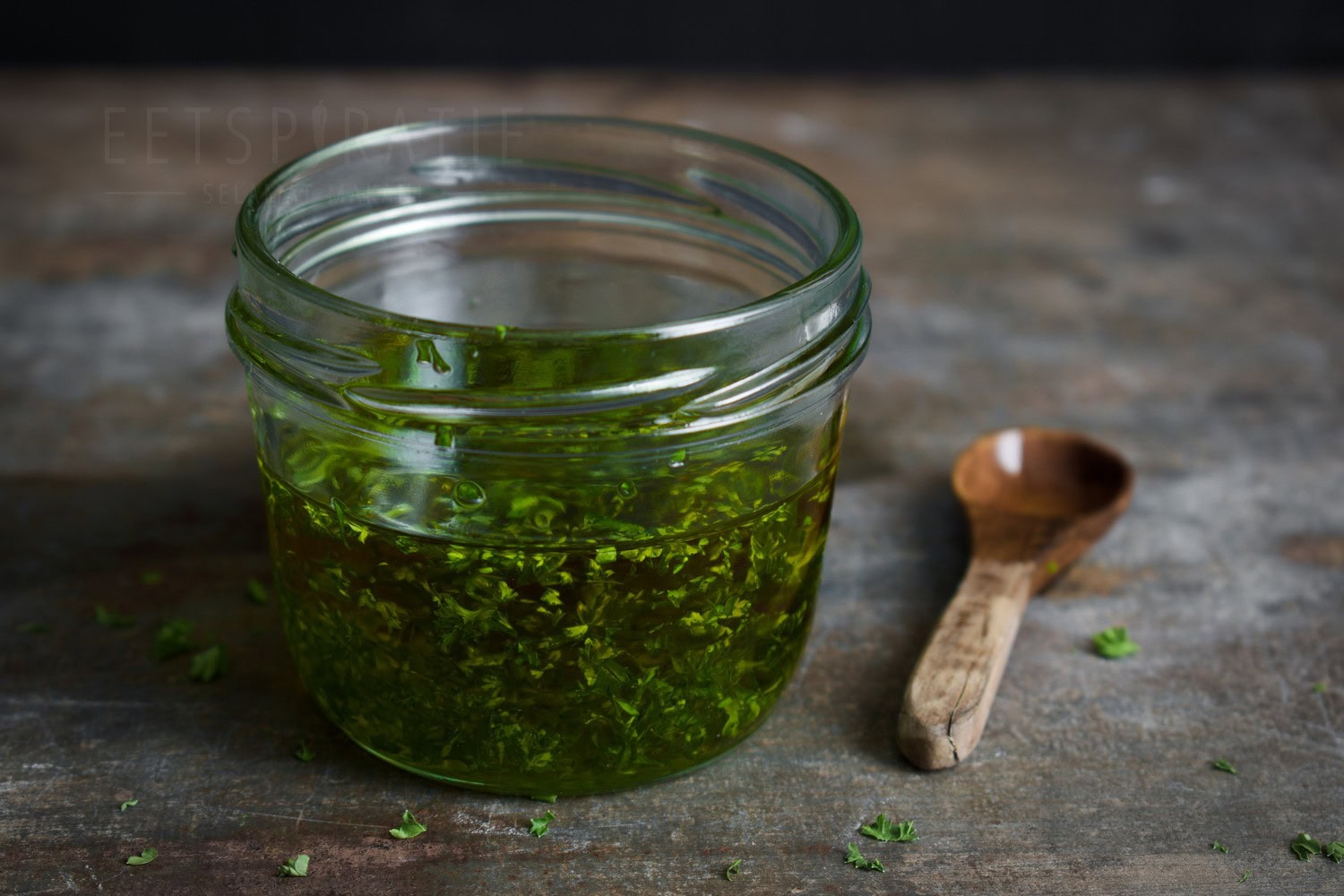 Voor dit recept gebruik je platte peterselie en geen krulpeterselie want die heeft een totaal andere smaak en textuur. Je gebruikt grotendeels de blaadjes maar gooi de steeltjes niet weg! Deze kun je invriezen en bijvoorbeeld gebruiken in soepen of stoofschotels. Je kunt ervoor kiezen de olie te verwarmen om de smaken te laten infuseren. Je hoeft de olie alleen te verwarmen. Laat het niet koken wat dat gaat ten koste van de smaak. Eerst verwarm je de olie met de knoflook en als laatste voeg je de fijngehakte peterselie toe zodat de groene kleur behouden blijft. Laat de olie afkoelen en bewaar in de koelkast. Je kunt de olie ook maken zonder het te verwarmen. Kies de manier die je zelf het handigst vindt.
