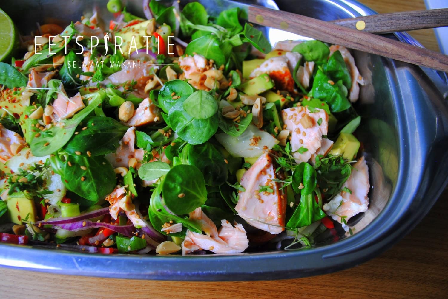 Deze zalmsalade eet je lauwwarm. Bak de zalm op de huid en verdeel deze in stukjes over de salade. Met drie stukken zalm kom je al een heel eind. Zalm past goed bij Aziatische gerechten. Het is heerlijk gecombineerd met een dressing van sojasaus, limoensap en sesamolie. Vissaus geeft de dressing een kick.