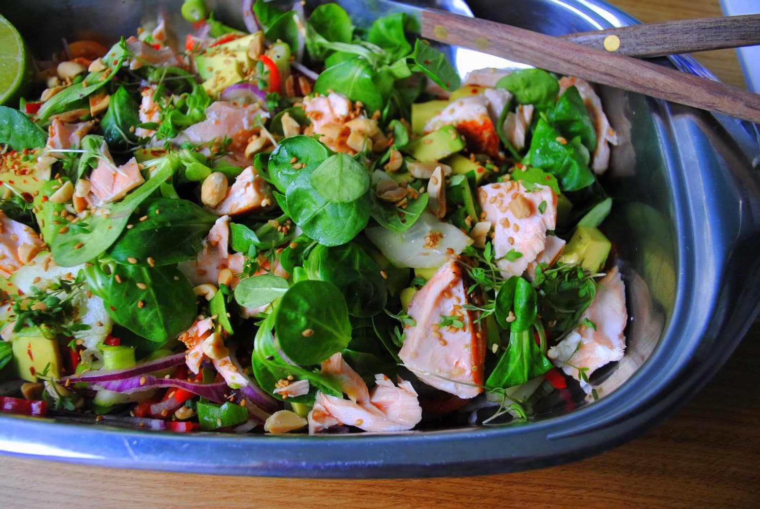 Salade met zalm en oosterse dressing, bomvol groenten en makkelijk te maken. Soms heb ik even geen eetspiratie en verzin ik ter plekke een gerecht. Zo ging het met deze zalmsalade. Ik sneed een berg groenten, bakte zalm en maakte een oosters getinte dressing. Het resultaat was een heerlijke maaltijd salade. Een makkelijk recept voor het weekend of op drukke doordeweekse dagen.