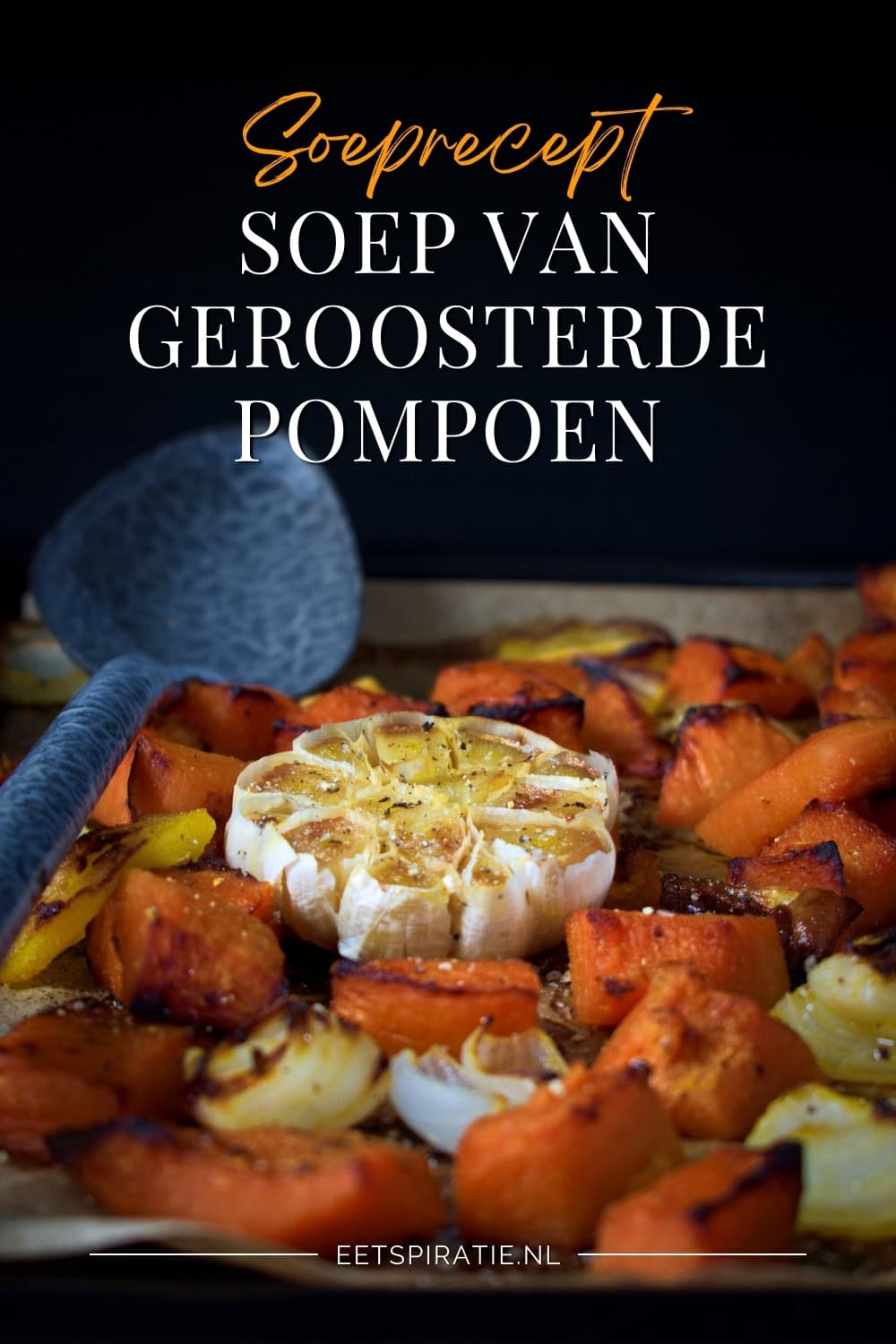 minutenSoep met geroosterde pompoen, zoete aardappel en knoflook. Door de pompoen te roosteren in de oven krijgt de soep een heerlijke volle smaak en de knoflook wordt lekker zoet. Serveer de soep met een krokante topping van bijvoorbeeld croutons en geef het een beetje pit met crispy chili olie.