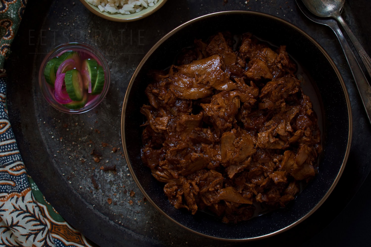 Hachee maar dan met een kleine Indische touch. Door specerijen toe te voegen – zoals nootmuskaat en kruidnagel en een beetje zoete ketjap – krijgt het een beetje die Indische warme smaak. Ook wordt er bij dit gerecht vaak laksa (glasnoedels) toegevoegd in combinatie met aardappels. Ik heb het lekker simpel gehouden en serveer mijn hachee met wortelstamp, sambal en gebakken uitjes.
