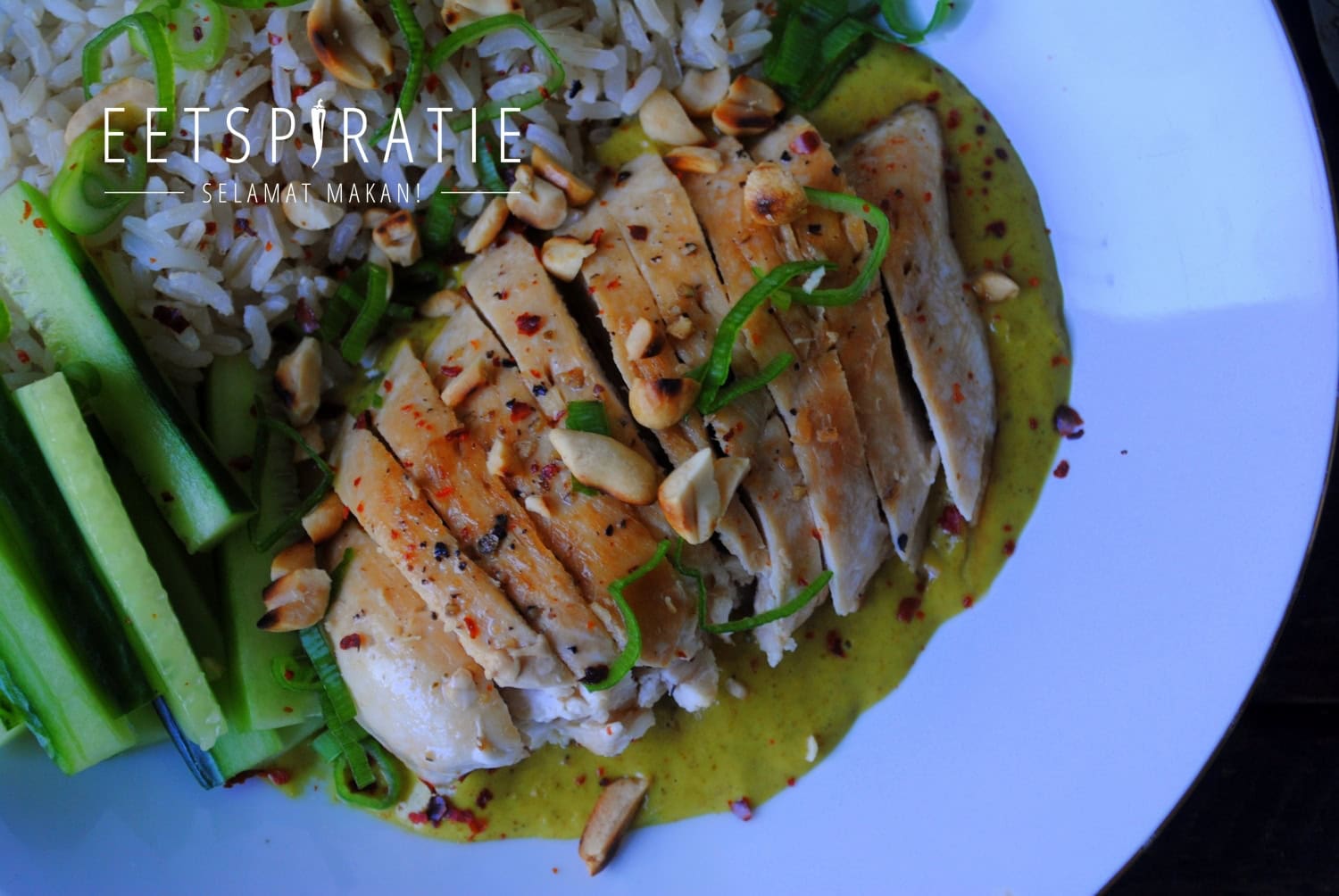 Dit gerecht maak je met een gele currypasta. Maak de currypasta volgens dit recept of gebruik een kant en klare versie van de toko of supermarkt. Je maakt met de currypasta, kokosmelk en pindakaas (of notenpasta) een saus die je serveert bij kip. Je kunt de kip ook vervangen voor plantaardige/vegan kipstukjes op basis van soja-eiwit of eventueel voor stukjes gebakken tofu.