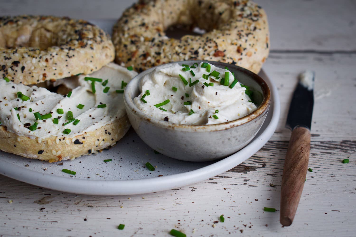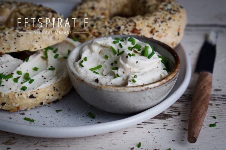 Het enige wat je hoeft te doen, is het blok tofu te blenden in een hakmolentje of foodprocessor en de smaakmakers toevoegen. En ja, tofu kun je rechtstreeks uit het pakje eten. Van zichzelf heeft het een neutrale smaak, dus je mag royaal zijn met kruiden en smaakmakers. Ik deel in de receptenkaart hieronder de manier waarop ik mijn roomkaas graag maak met mijn ‘geheime’ ingrediënt: augurkennat. En roomkaas hoort natuurlijk op een bagel. Bagels kun je heel makkelijk zelf maken. Kijk hier voor een lekker en eiwitrijk bagelrecept.