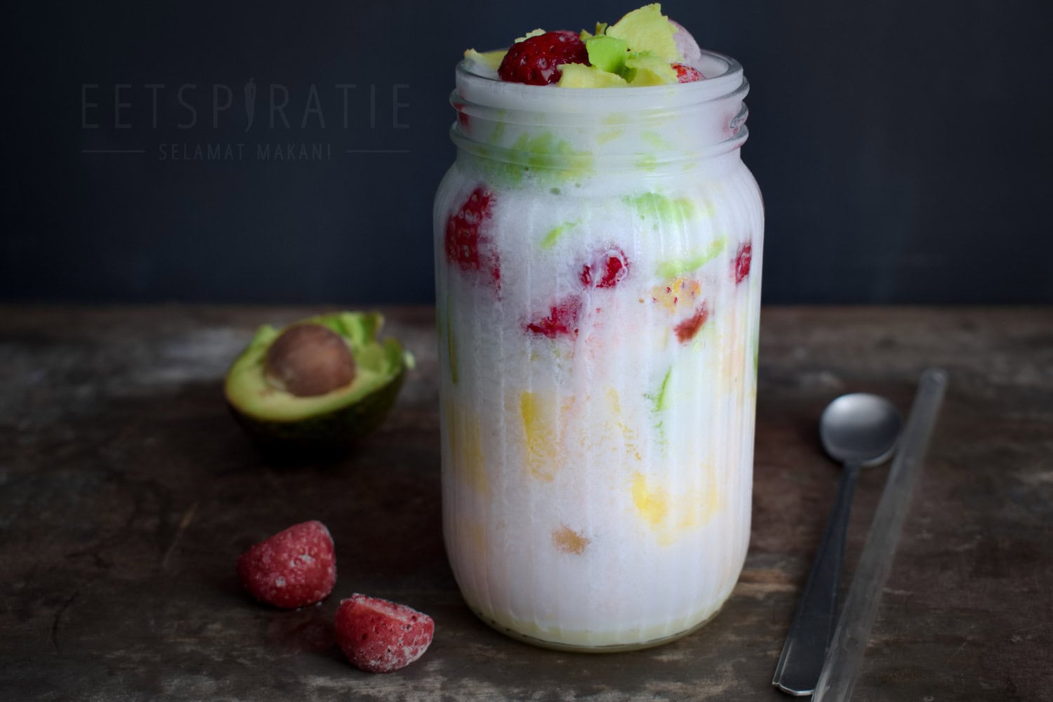 Verfrissende Indonesische fruitcocktail – es teler. Geen authentiek recept maar een combinatie van twee heerlijke recepten. Namelijk: es Shanghai en es teler. Dit zijn twee verschillende soorten ‘ijsjes’ of fruitcocktails. In het ene recept zit onder andere schaafijs en een siroop zoals rozensiroop. In de andere zit verse kokos en fruit zoals avocado en jackfruit. Ik heb hier een soort eigen versie van gemaakt die je met ingrediënten kunt bereiden die makkelijk in de supermarkt te vinden zijn.