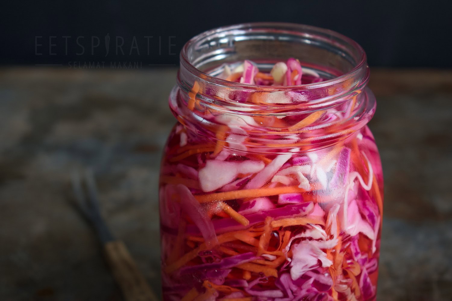 Zoetzuur van rode kool en wortel – snel recept, zo snel heb je nog nooit een pickle gemaakt! Iets dat nooit mag ontbreken op mijn bord of een broodje is een zoetzuur, pickle of ingelegde groenten. Het maakt gerechten net iets lekkerder en de fris/zure smaak geeft je eten een kick. Binnen 5 minuten maak je zonder enig snijwerk deze zoetzuur van rode kool met wortel. Je voegt de ingrediënten samen, laat deze intrekken en na een paar uur is het ready to eat.
